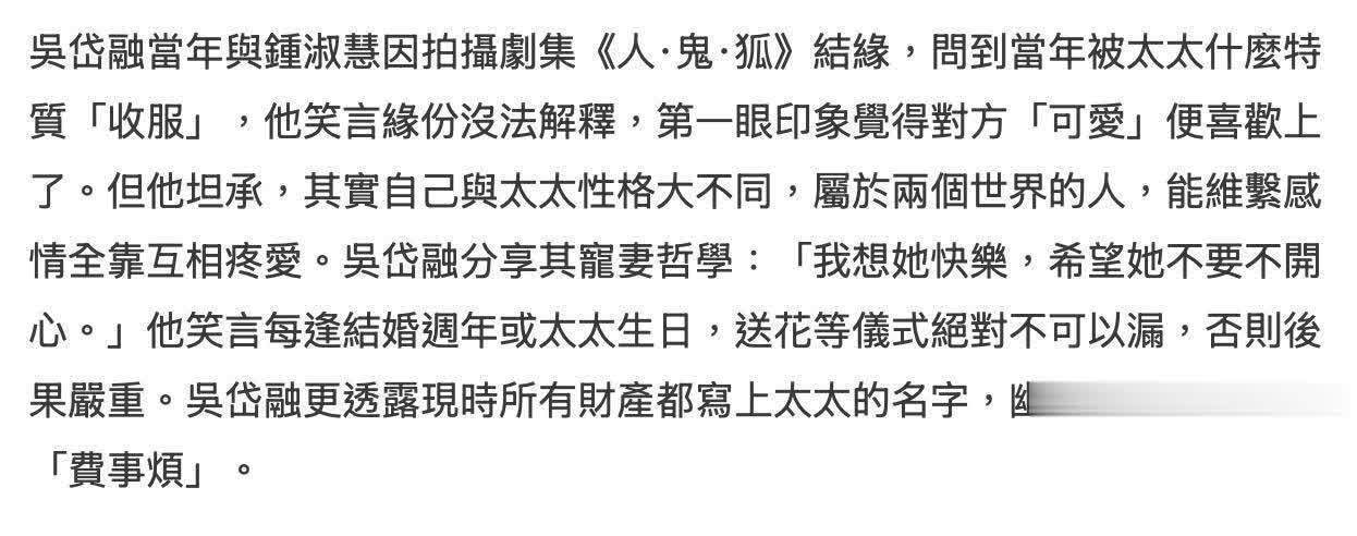 在结婚后这些年,吴岱融与妻子的生活居无定所,四处为家,从香港搬到内地,又从内地搬回香港,还去了马来西亚槟城生活,还有新加坡,这还真不是所有女人都愿意过这种漂泊的生活,钟淑慧做到了说明她是真爱吴岱融。吴岱融回馈妻子最佳的方式,除了不离不弃,把所有财产都写上妻子名字,这是物质上的给予,而这么多年的努力,吴岱融身价也算是丰厚,至少也有半亿以上,比上不足比下有余。